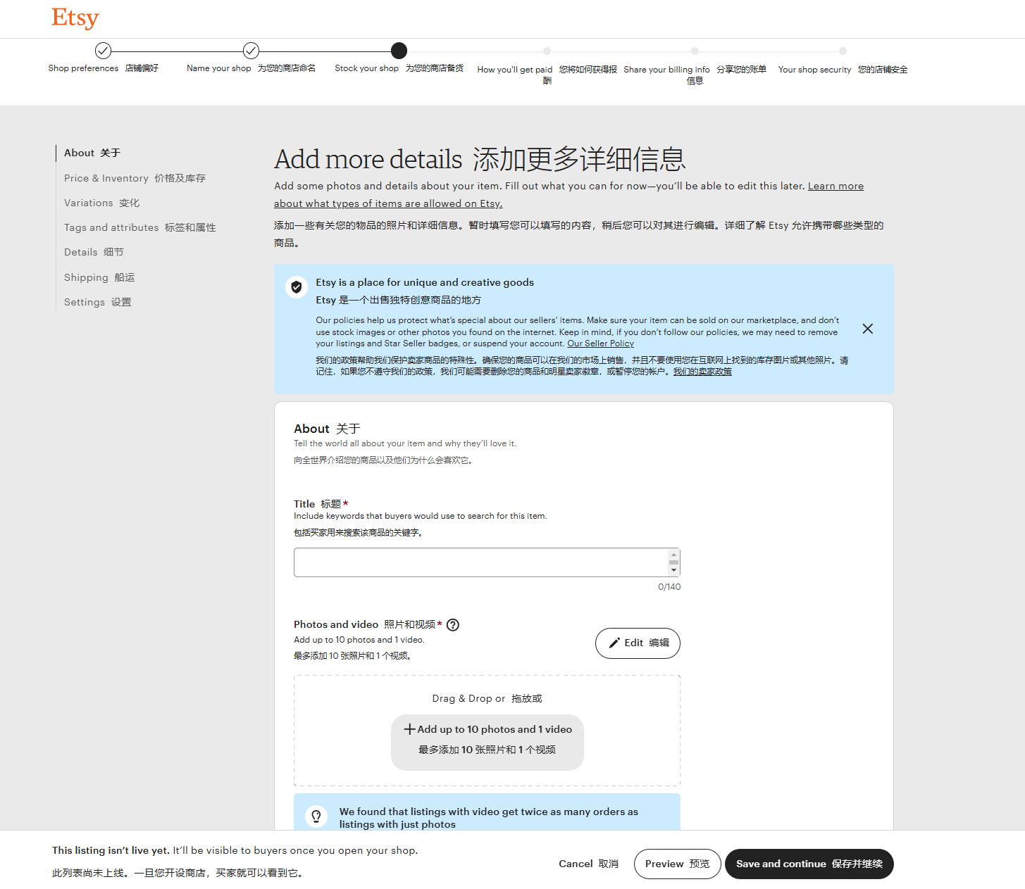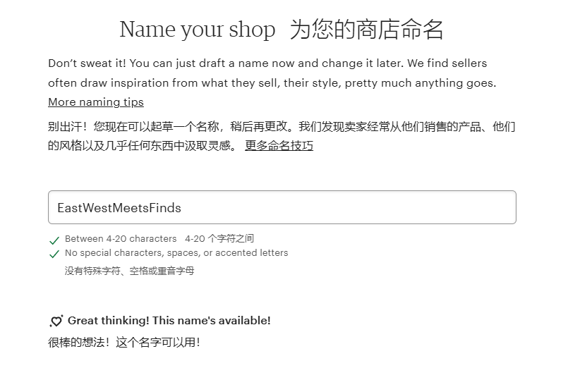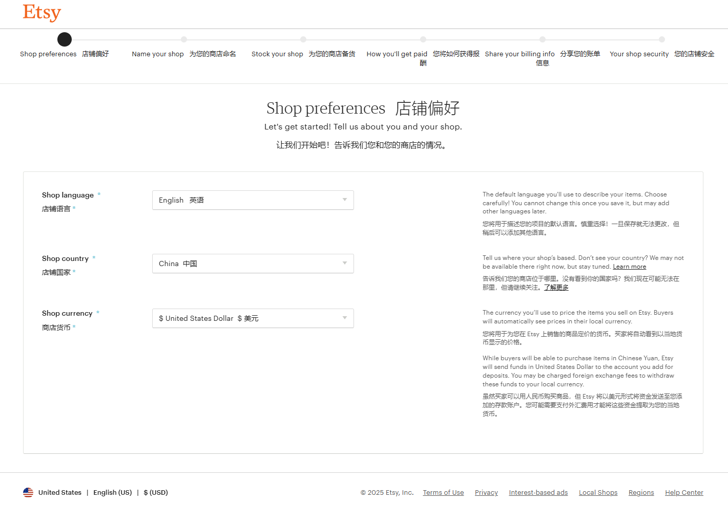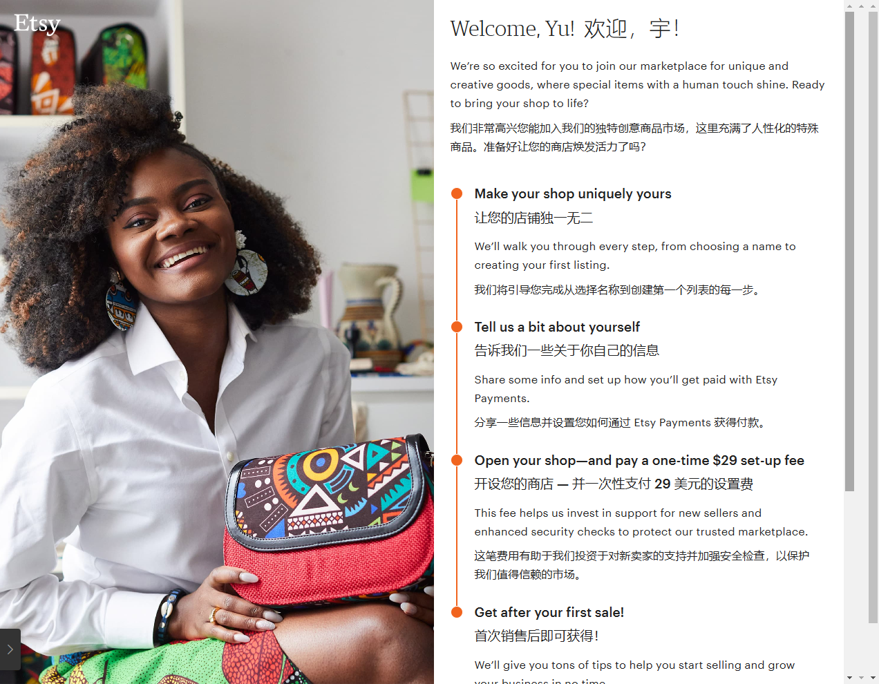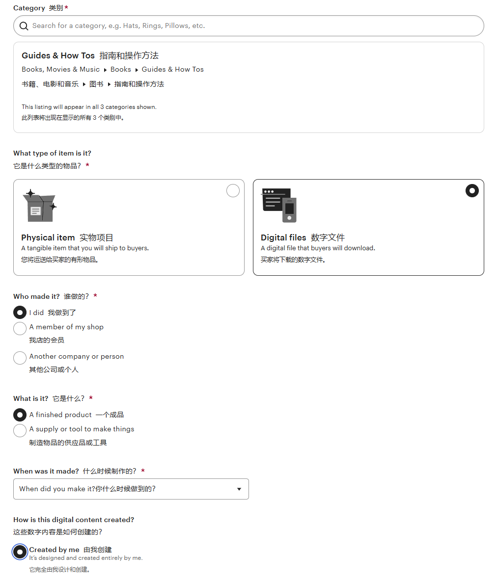 shiyi Open your shop—and pay a one-time $29 set-up fee 开设您的商店 — 并一次性支付 29 美元的设置费 在这里我的语言选择的英文,店铺国家选择的中国,货币选择的美元,仅代表我个人的选择。 为自己的店铺起一个名字 这个就是让你选择产品类别,我选的是【指南,操作手册】,然后是选择数字文件,然后选择由我创作。 这一步骤我还没想好,先到这里吧,下次有机会再继续